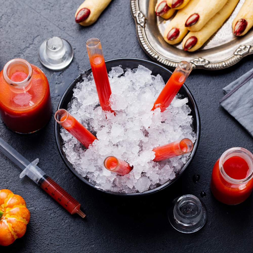 Erhalten Sie keine Angst, mit gruseligen Cocktails herumzuspielen und versuchen, schädelförmige Cocktail-Picks zu kaufen, oder so ähnliches, wenn möglich. DiesBlackberry Thymian Prosecco Fizz Mischt einen tiefen Blackberry-Sirup mit einem Blackberry- und Thymian-Spieß ein. Wenn Sie ein wirklich blutiger Look wollen, ist dasBlut Orange Margarita. ist einfach und hat die perfekte Ästhetik. Sie können sogar Getränke in Fläschchen oder Reagenzgläsern servieren.