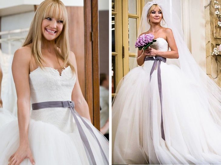 Liv (kate hudson) inBrautkriegewurde mit einem klassischen und anfallend schönen Hochzeitskleid geschmückt. Der weltbekannte Modedesigner Vera Wang drückte den Umschlag mit diesem Hochzeitskleid-Design mit einem herzförmigen Ausschnitt mit einem schlanken violetten Bandband.