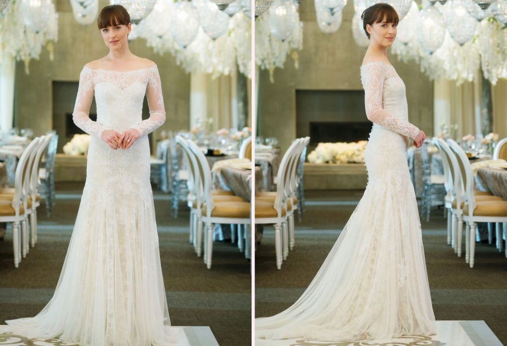 In fünfzig Farbtönen, befreit, trug Anastasia Steel (Dakota Johnson) ein wunderschönes Kleid für ihre Hochzeitszeremonie mit Christian Gray (Jamie Dornan). Der Kleidungsdesigner, Monique Lhuillier, wollte etwas schaffen, das mit traditionellem Modernes, das mit traditionell modern überbrückt wurde, der auch die Persönlichkeit von Anastasia widerspiegelte.