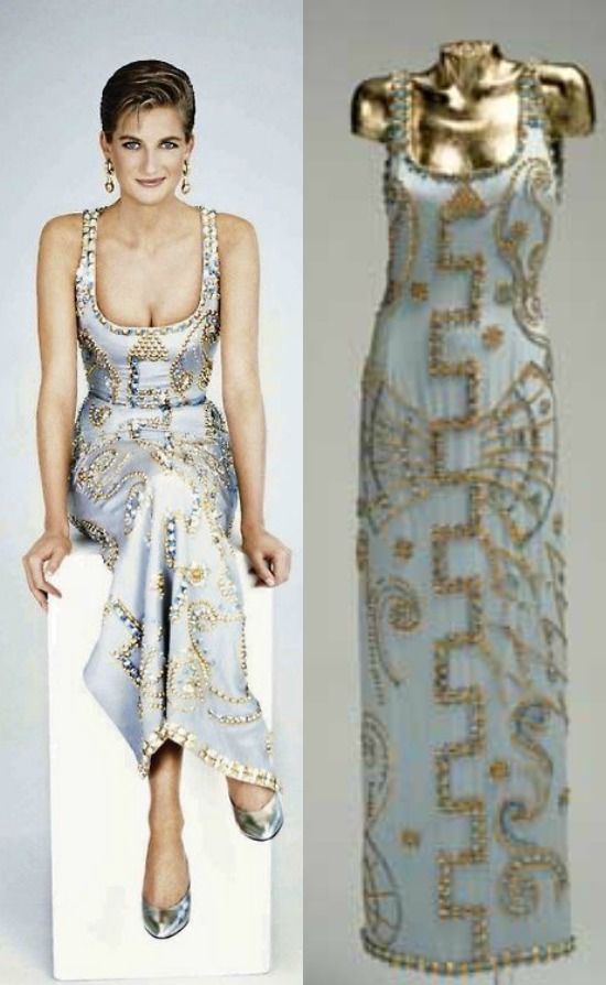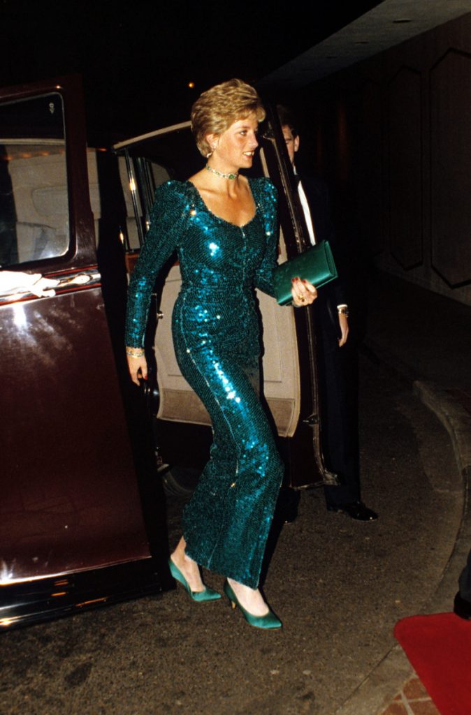 Diana war eine Vision in diesem slinkigen, umarmenden Kleid durch Versace mit akribischer Stickerei. Es war einer der untersetzten Looks des Designers und passt perfekt zur Figur dieses königlichen Familienmitglieds.