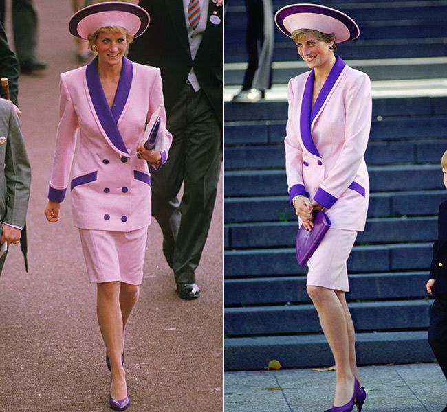 Sie war bekannt dafür, dass sie monochromatische Anzüge mit ihrem Lieblingsdesigner Catherine Walker trägt. Aber wir lieben uns, als sie außerhalb der Kiste dachte, wie mit diesem rosa Anzug mit einzigartigen lila Detailing und Schuhen und Kupplungen derselben Farbe. Dies ist ein Diana-Stil-Detail, wenn wir je gesehen haben.