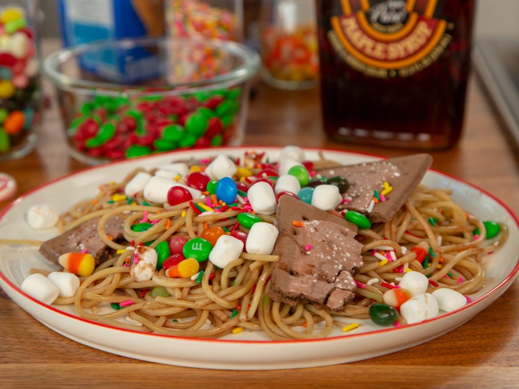 Diese Szene ist so störend, da es fasziniert ist. Das Konzept des Frühstücks Spaghetti gemischt mit Sirup, Pop-Törtchen und einem Bündel anderer zuckerhaltiger Bits klingt irgendwie grob, aber auch irgendwie erstaunlich. Schließlich sind es nur süße Nudeln, richtig? Viele Kulturen haben das! Wir waren alle neugierig auf den Geschmack dieser Schüssel, als wir diesen Flamm schauten.