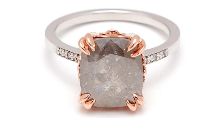 Wissen Sie, dass graue Diamanten sind sehr selten, vor allem in dieser enormen Größe? Diese Rinde ist einfach faszinierend und wir lieben die kleine Rose Gold Kralle Details. Die kleinen Cluster von Diamanten auf den Seiten nicht verletzen unseren Augen nicht.
