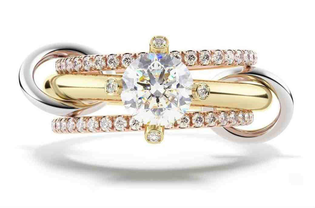 Wir lieben diesen Ring für die ungewöhnliche Mischung aus Metallen und einzigartiger Form. Der Artemis-Ring verfügt über alle drei Arten von Gold - gelb, weiß und Rotgold. Außerdem sehen alle jene prickelnde Steine auf. * Drools ein wenig *