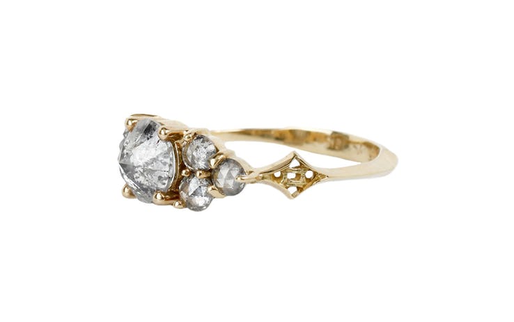Die Form und das Design dieses Verlobungsring gibt uns Renaissance Fair Vibes. Es ist empfindlich und köstlich, aber zugleich sieht es auch ein wenig rau. Ein echter Rohdiamant - liebend dieses Nebeneinander.