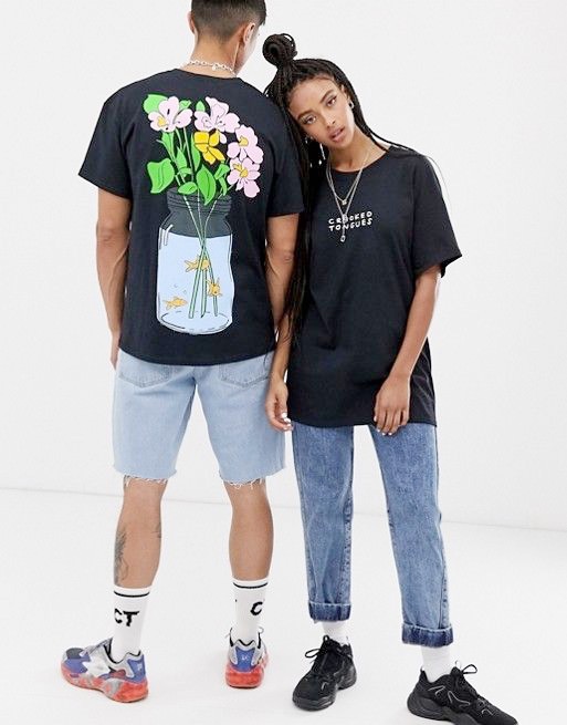Übergroße T-Shirts sind die besten. Sie können sie ankreuzen, wenn Sie Ihre Taille definieren möchten, Sie können sie als Kleid tragen, oder Sie können sie direkt über Ihre Jeans tragen, um der übergroßen Atmosphäre hinzuzufügen. Es ist möglicherweise die einfachste, dennoch effektivste Option, wenn Sie diesen geschlechtsneutralen Look gehen.