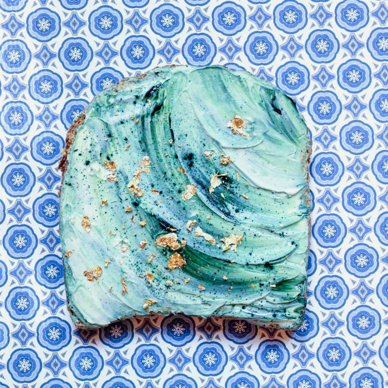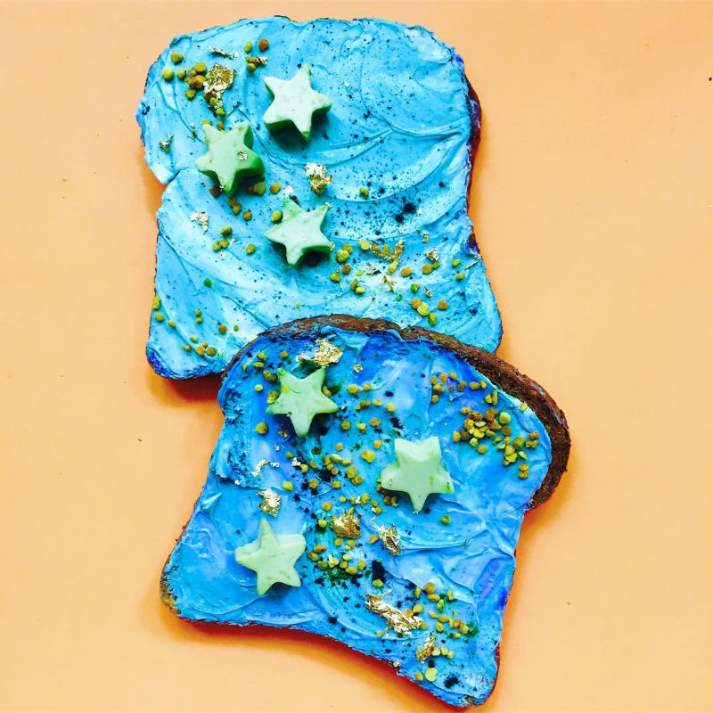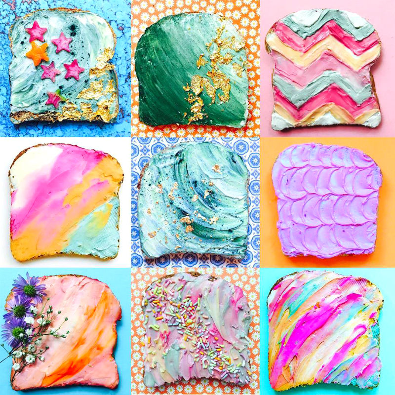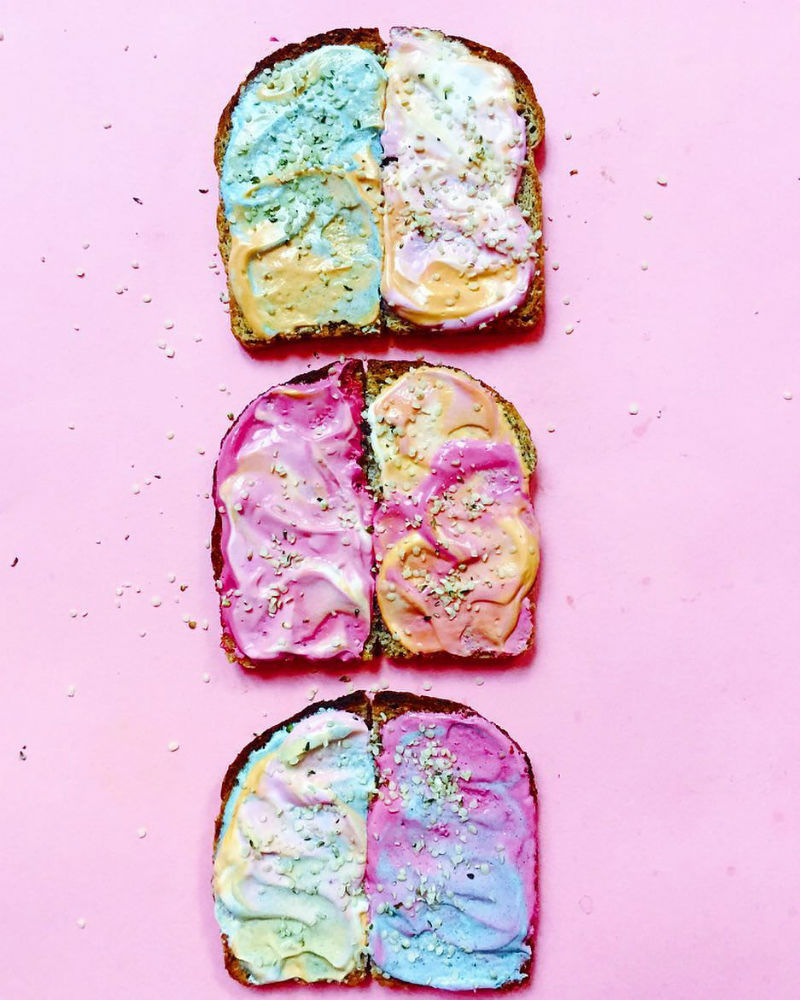 Im Gegensatz zu den schrecklichen Einhornfrapps bei Starbucks besteht der Toast-Kunst von Adeline aus natürlichem Farbstoff, sodass Sie sich keine Sorgen um Ihre Gesundheit machen müssen. Rosa wird mit Rübensaft, Gelb und Orange mit Kurkuma, Grün mit Chlorophyll und Spirulina oder einfriert gebratenem Blaubeerpulver für Purpur und Blues erreicht.
