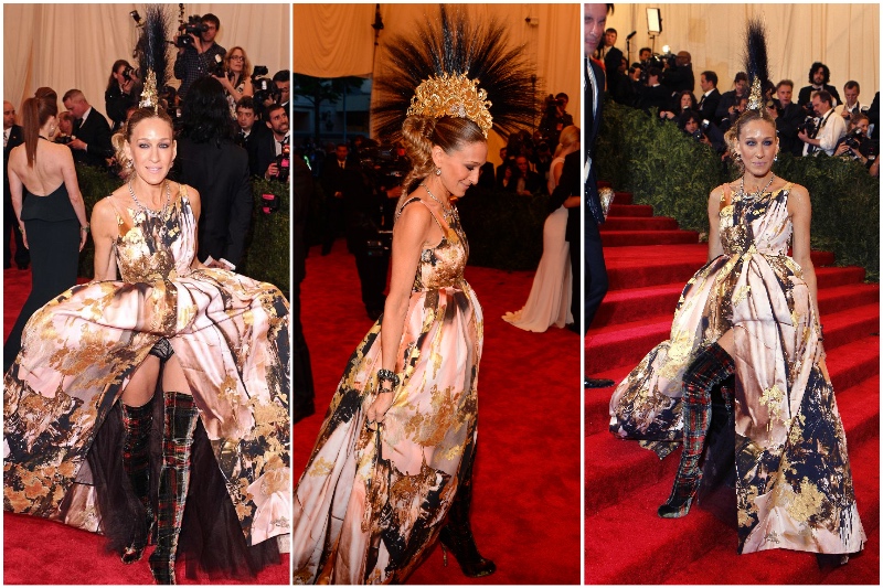 Sarah Jessica Parker ist immer wieder aufgetaucht, etwas Neues und mutig zu versuchen, wenn es um Mode geht, aber das war auch für sie ein bisschen übertrieben. Sie sah grundsätzlich auf wie ein Pfau in diesem Kleid, und das komische Kopfschmuck machte es nur noch schlimmer. Oh Sarah, warum hast du das dir selbst getan?