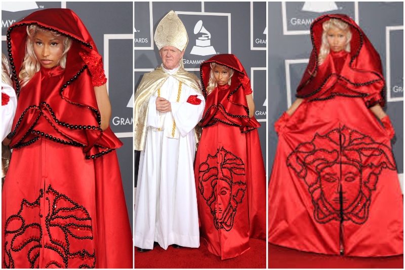 Zu sagen, dass diese Outfit-Wahl umstritten war, wäre eine Untertreibung. Es ist nicht einmal das komische rote Kleid / das Kap, das sie trägt, der die Öffentlichkeit am meisten schockiert hat. Vielleicht, wenn sie so anders ankleidet wäre, wäre es nicht so schlimm, aber es ist die Tatsache, dass sie mit einer Person auftauchte, die als Papst angreift, der alle mit Kritiken verrückt ließ.