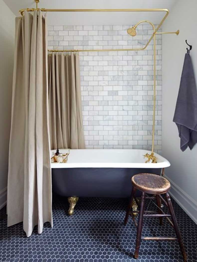 5. Dieses einzigartige und regal lila Badezimmer ist für eine Königin geeignet. Die goldenen Details sind erhaben, zusammen mit dem doppelten Duschvorhang, den die meisten Klauenfußwannen nicht den Luxus haben, der keinen Luxus enthält. Das Beste aus beiden Welten, und wir lieben den samtigen Farbton von Purpur-Indigo, in dem die Fliese, die Wanne und der Hocker gefärbt sind. Außerdem vergessen Sie den freiliegenden Ziegelstein - diese Marmor-Ziegelstil-Rückwand? Das könnten die Fliesen sein, die im Himmel sind.