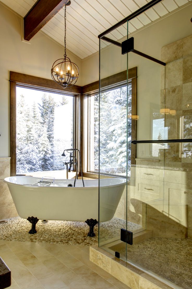 9. Dieses rustikale Badezimmer irgendwo in den schneebedeckten Bäumen ist ein Traum wahr. Wir lieben die Lichter, die über dem freistehenden Wanne hängen, sowie die majestätischen, dunklen Krallen auf der ansonsten Elfenbeinwanne mit einer erstaunlichen Ansicht. Die Tatsache, dass es auf seiner eigenen Fliesenanordnung steht, die dem Duschboden entspricht, ist so schick!
