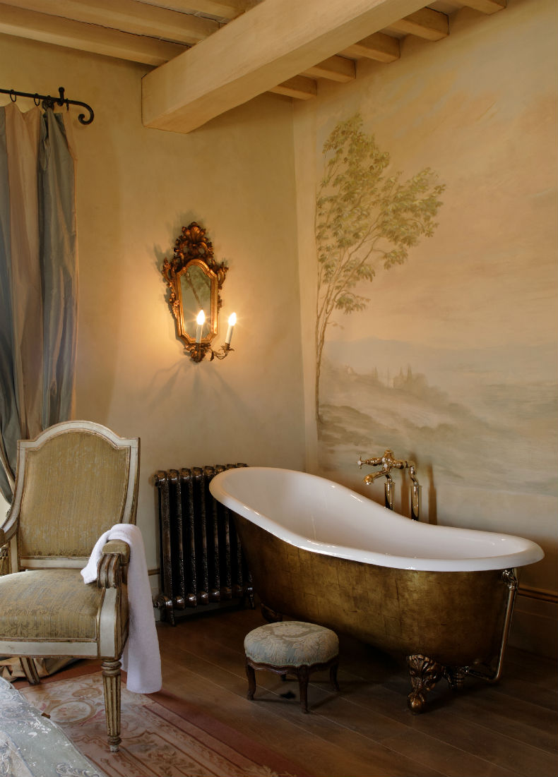 2. OMG. Die rostige Kupferwanne war verlockend, aber dieser goldbeschichtete mit einem leicht angehobenen Rand für ultimative R & R sieht so reich an. Direkt neben der Toasty Heater, von Kerzenlicht und dieser verträumten Landschaft, die an der Wand lackiert ist, möchten wir in dieser Wanne den ganzen Winter in dieser Wanne überwintern.