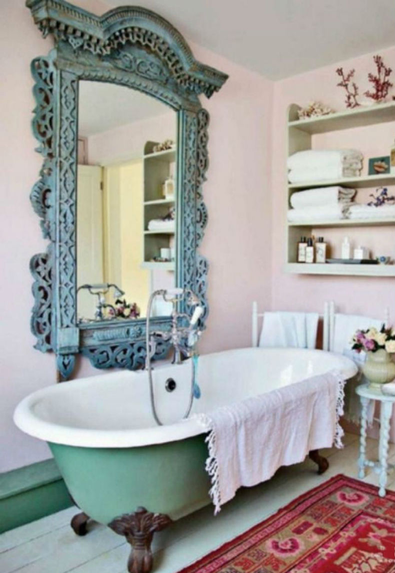 1. Wir lieben das Spiel auf Pastells hier und fühlen sich so ein Schuss, der gerade aus dem Badezimmer von Marie Antoinette geschossen wird! Die Zweige auf dem Mantel gegen die rosa Wände und den passenden Stuhl sind absolut göttlich. Und eine hellgelbe Badewanne sollte ausgeschaltet sein, aber wir lieben es.