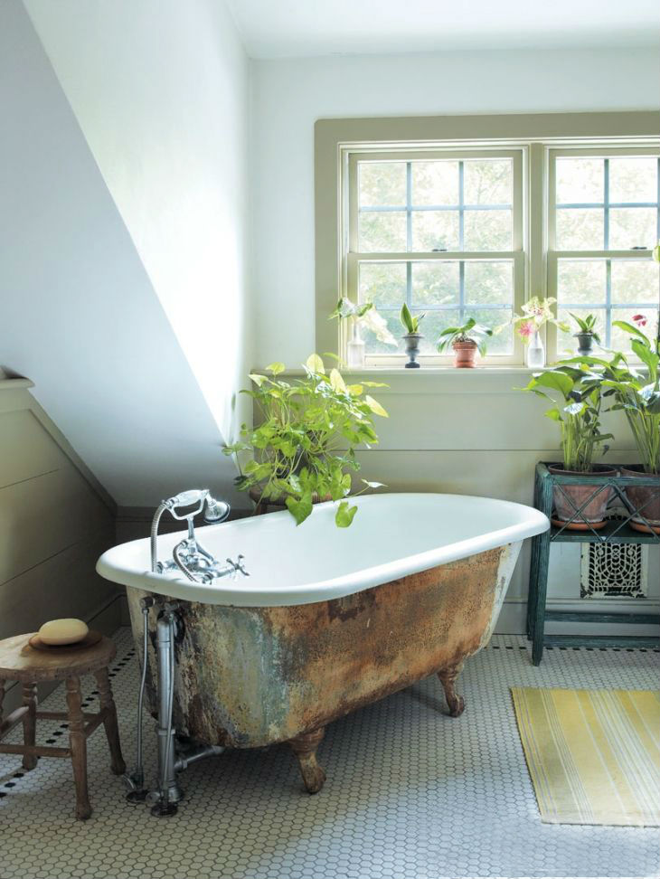 7. WOW! Eine metallische Klauenfußwanne ist etwas, was wir nie dachten, wir würden sehen, aber eindeutig existiert alles da draußen, und dieses Baby ist sehr ig-würdig. Von der Factory-Chic bis zum Kupfery, verrostete Aussehen der Wanne, lieben wir diesen unverwechselbaren Blick, der mit einer sauberen weißen Umgebung und einer Tonne Pflanzen gepaart ist. Dies könnte die Wanne sein, die wir an der Spitze unserer Wunschliste wünschen.