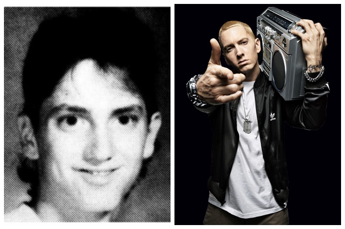 Eminem sieht aus wie ein solcher Geek in seinem Kinderfoto. Glaubst du, dass das doof-Lächeln der Grund ist, warum er sich entschieden hat, nicht mehr zu lächeln?