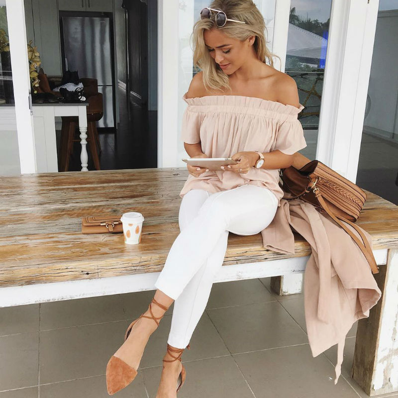 Wer sagt, dass Sie mit den Overalls nicht von der Schulter koppeln können? Dieser weiße und hellrosa Look wäre erstaunlich bei einem Grill, einem Konzert, einem Konzert oder einem lässigen Hängen mit den Mädchen. Die Gesamtgurten mit der Schulterbluse schafft die Illusion von Ausschnitten und macht Ihren Tan-Pop wirklich. Es ist ein erfrischender Look, den wir nicht warten können, um es auszuprobieren. Und du?