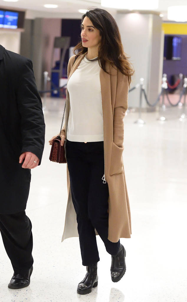 8. Dieser lässige Flughafen ist alles. Amal liebt ihren Duster Cashmeres und warum nicht? Sie sieht erstaunlich in ihnen aus. Dieser ist von Akris, gepaart mit Cool-Girl-Hosen und weißem T-Shirt, fertig von Chunky Jimmy Choos.