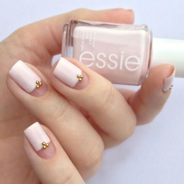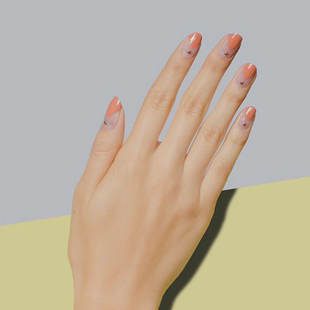 8. Dieses Pfirsich-umgekehrtes Dreieck mit einem goldenen Punkt an der Basis jedes Nagelbetts ist so einfach, aber nur rechtzeitig für den Frühling. Wir lieben eindeutig das freiliegende Nagelbett, sondern lieben die Wendung des invertierten Dreiecks auf diesem. Mit welchen Ausschnittsformen würden Sie spielen?