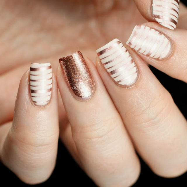 1. Diese neutrale und rosafarbene Goldmaniküre ist der ideale Weg, um ein ganz offenbares MANI ein wenig Funkeln hinzuzufügen. Die dünnen Streifen und der einzelne metallische Look sind perfekt mit fast jeder Outfit-Wahl.