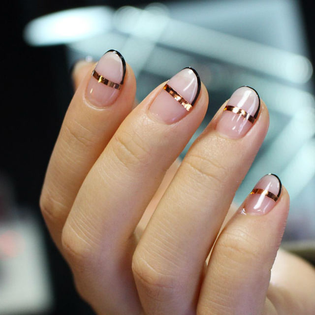 2. Dieser rosa und goldene Look mit einem zarten schwarzen Tip-Futter ist absolute Perfektion, nicht nur für den Arbeitsplatz, aber jede Gelegenheit, an die wir uns denken können. Es ist wie ein Mini-Ring für jeden Ihrer Nägel! Schlanke auf kurzen oder etwas längeren Nägeln.