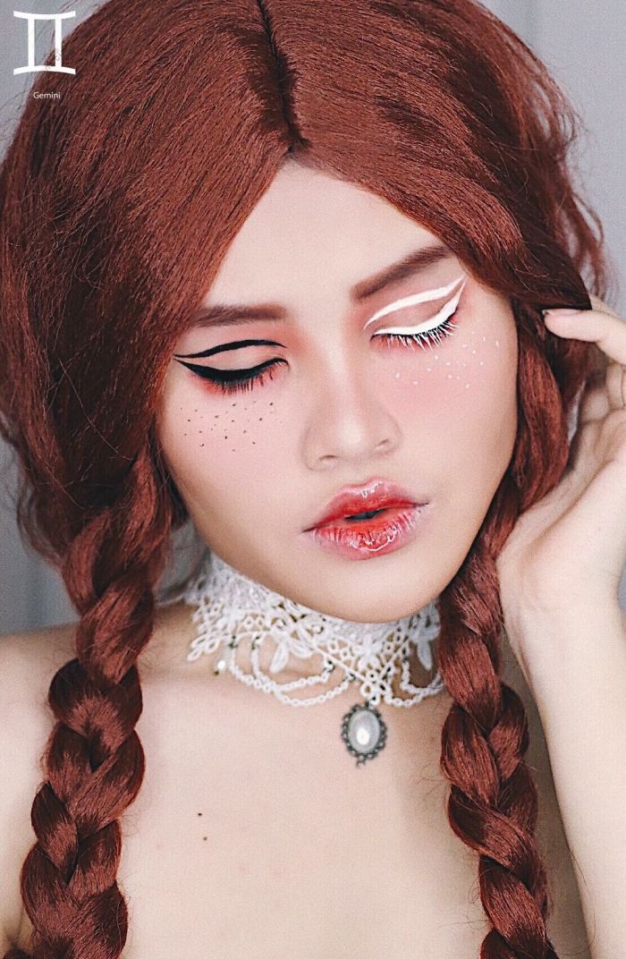 Gemini duellieren Natur wird durch entgegengesetzte Farben im Augen Make-up vertreten. Eine Seite ist schwarz, der andere weiß ist. Auch die Sommersprossen schwarz und weiß. Das rote Haar fügt Verspieltheit auf den gesamten Look.