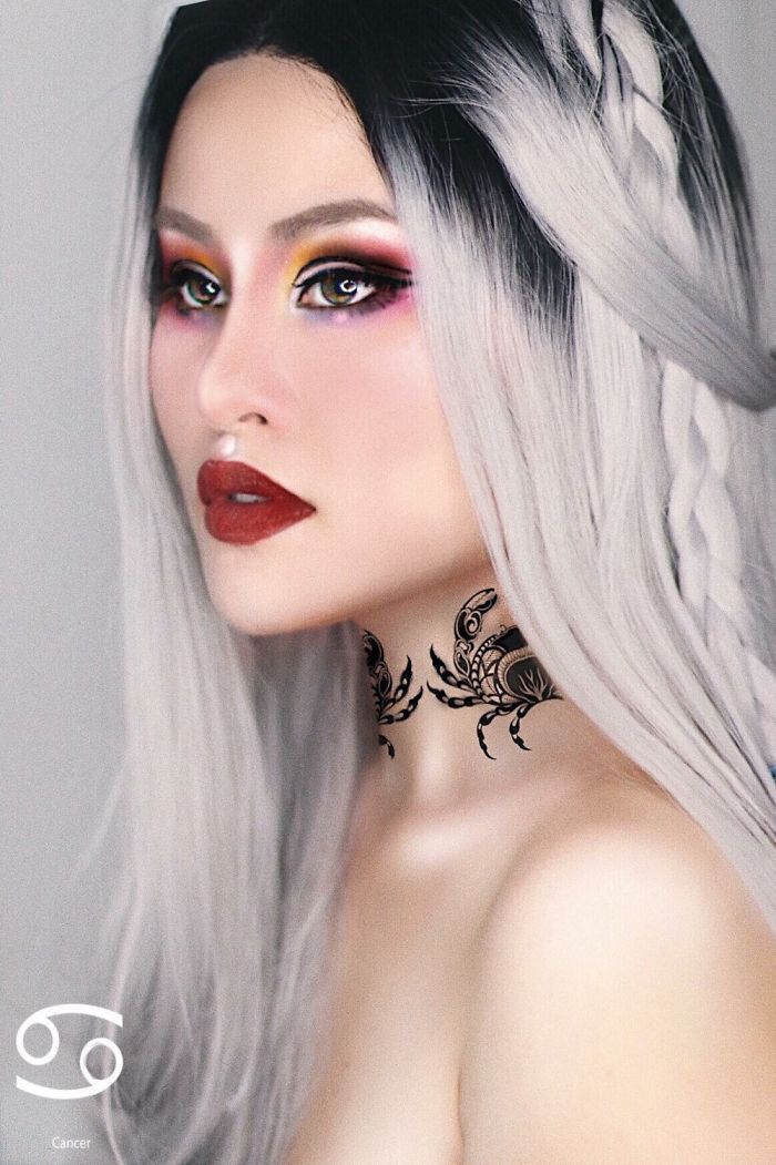 Krebs kam auch ziemlich Badass. Die schwarzen Silber ombre Haar gibt ein kälteres Gefühl zu diesem Look, aber das bunten Augen Make-up verhindert es aus der Betrachtung ausgewaschen. Der Krebs Hals Tattoo fügt auch ein rebellisches Gefühl.
