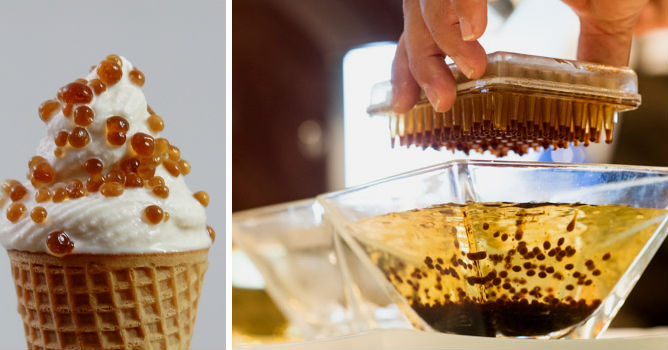Art von Bubble Tea Tapioka für Kaviar. Köche hinzufügen es sich zum Nachtisch sowie herrschöne Entschlüsse, und es ist auf Social Media aufblasen. Lavetta macht ihren Unterzeichnungskaviar von "mit einer Spritze und kleinen Tropfen Kaffee. Alginat-Mischung wird dem verdünnten Calciumchlorid zugesetzt. " Schick.