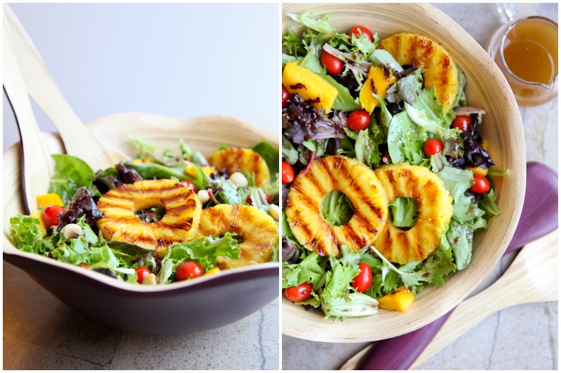 Wir sind der festen Überzeugung, dass Sommersalate in ihnen einen Hauch von Süße haben sollte und diese Salat passt auf jeden Fall diese Anforderung. Gegrillte Ananas, Mango, Kirschtomaten und viel Salat, beträufelt mit Balsamico-Vinaigrette und besprüht mit einigen Macadamia-Nüsse sind eine gute Aroma-Kombination.