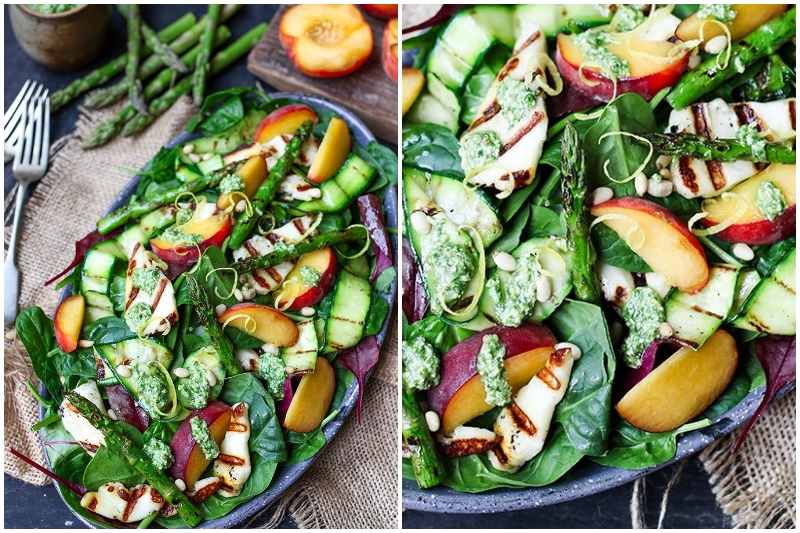 Wenn Sie den vorherigen Salat gemocht, aber Sie sind Vegetarier dieses die perfekte Wahl für Sie. Es hat gegrillten Halloumi, Spargel, Mischgemüse, Pinienkernen und natürlich Pfirsiche. Das hausgemachte Zitronen Pesto-Dressing ist auch ein Genuss.