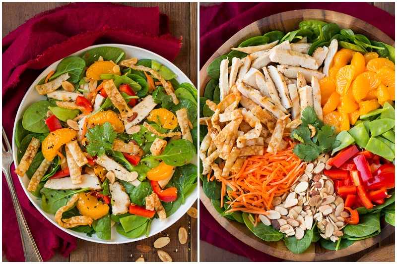 Keine Sorge, das ist nicht nur Salat Mandarinen und Spinat. Es enthält auch gegrilltes Huhn, roten Paprika, Erbsen, Karotten und gehobelten Mandeln. Es ist der perfekte knackige Salat für den Sommer. Die Zitrone Honig Ingwer-Dressing ist zu töten. Im Ernst, müssen Sie es einmal versuchen und Sie es auf allen Ihren Salaten wollen werden.