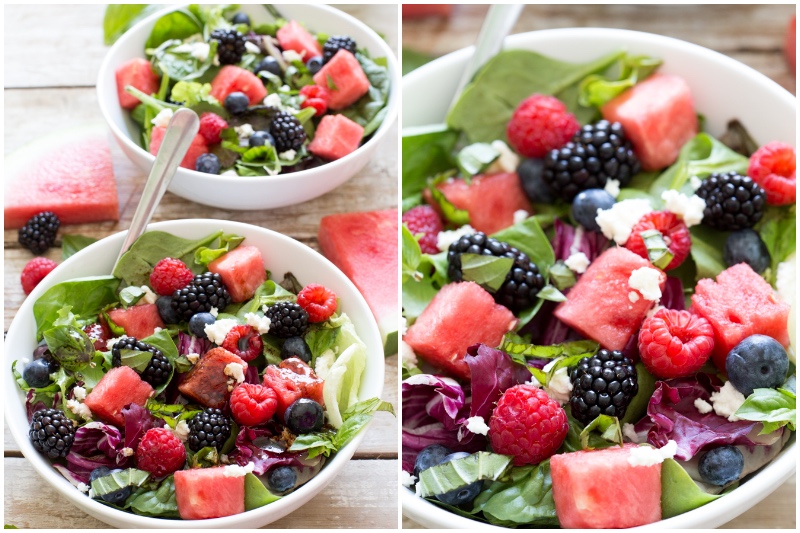 Ist es nur mir so oder tut jeder live auf Wassermelone im Sommer? Wenn Sie Wassermelone lieben, werden Sie diesen Salat lieben. Frischer Salat, süße Wassermelone und frische Beeren wie Heidelbeeren, Himbeeren und Brombeeren gehen perfekt zusammen. Die zerbröckelte Feta fügt einige leckere Proteine und die Zurichtung Bindungen alle zusammen die Aromen.