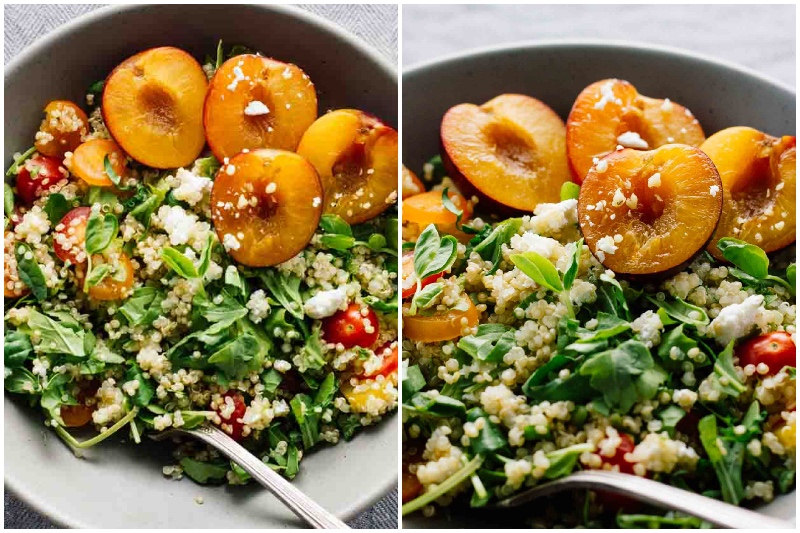 Die Kombination aus Süßkirsche Pflaumen, Trauben und Tomaten, zerbröckelte Ziegenkäse, einige Spinat und Rucola und Quinoa ist ein himmlisches Vergnügen an einem Sommertag. Sie können für putzt, Olivenöl und etwas Zitronensaft verwenden oder einen Salat Ihrer Wahl Dressing holen. Dieser Salat dauert nur ein paar Minuten zu machen und es ist glutenfrei und vegetarisch. Es ist eine Win-Win!