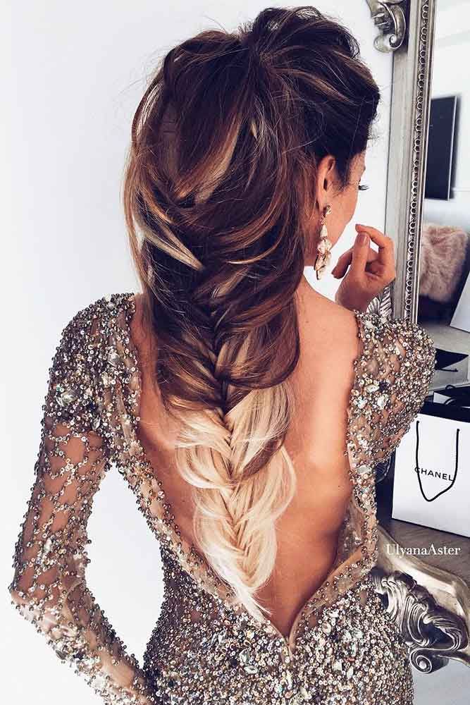 5. Für die etwas weniger traditionelle Braut gelangen wir dieses lange Fischtail-Pony (vor allem mit diesem Babe der BLECHEN-Ombre.) Wer sagte, dass ein Pferdeschwanz nicht fabelhaft sein könnte. Dieses auseinandergezogene, gut gestaltete Zopf hat ein paar Teile, die das Volumen an der Vorderseite erzeugt, und mischen einen Up-Do-Stil mit einem lässigen Look, der das Gesicht trotzdem der Fokus (und ein Paar von Badass-Ohrringen) ermöglicht.
