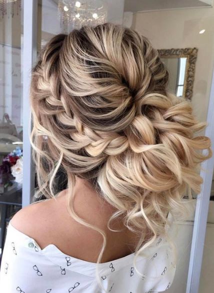 7. Dieses unordentliche Up-Tun mit einem Seitenzopf ist ideal für lockige Babes, oder Sie können immer wieder eine Bun-Erweiterung hinzufügen! Wir lieben den losen Strauß gekräuselten Schlössern, mit einem kehrenden und gut integrierten Zopf und einem Haar, das sich in der Nähe des Nackens hängt.