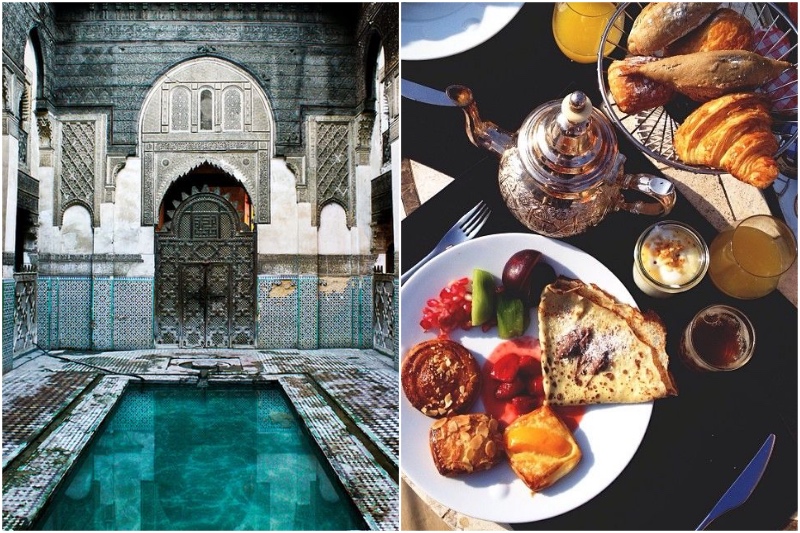 Ein traditionelles marokkanisches Frühstück besteht meist aus Kaffee, Orangensaft, süßer Pfannkuchen mit Honig, einige Ziegenkäse, Oliven und Spiegelei. Natürlich müssen Sie all diese Dinge auf einmal nicht essen, aber das sind die üblichen Entscheidungen, die Sie bekommen.