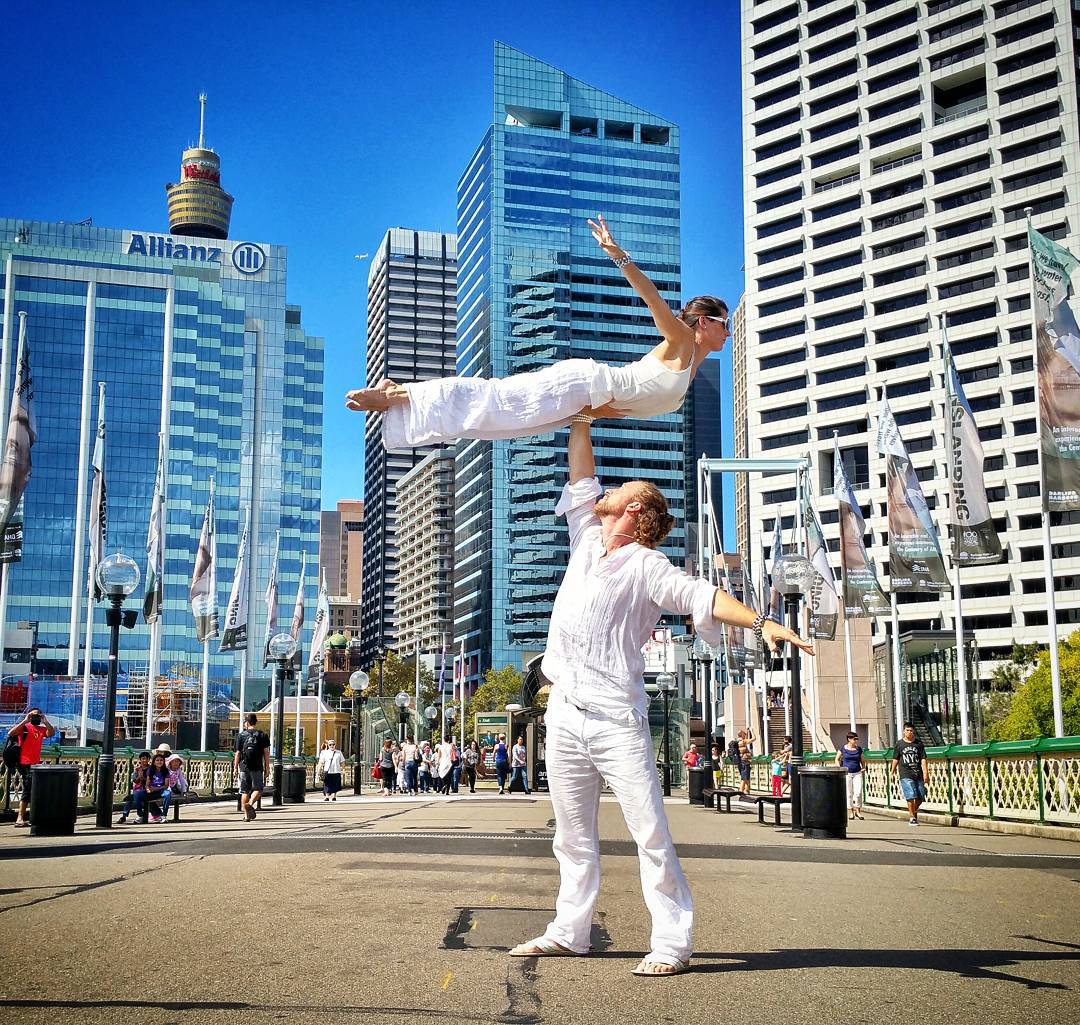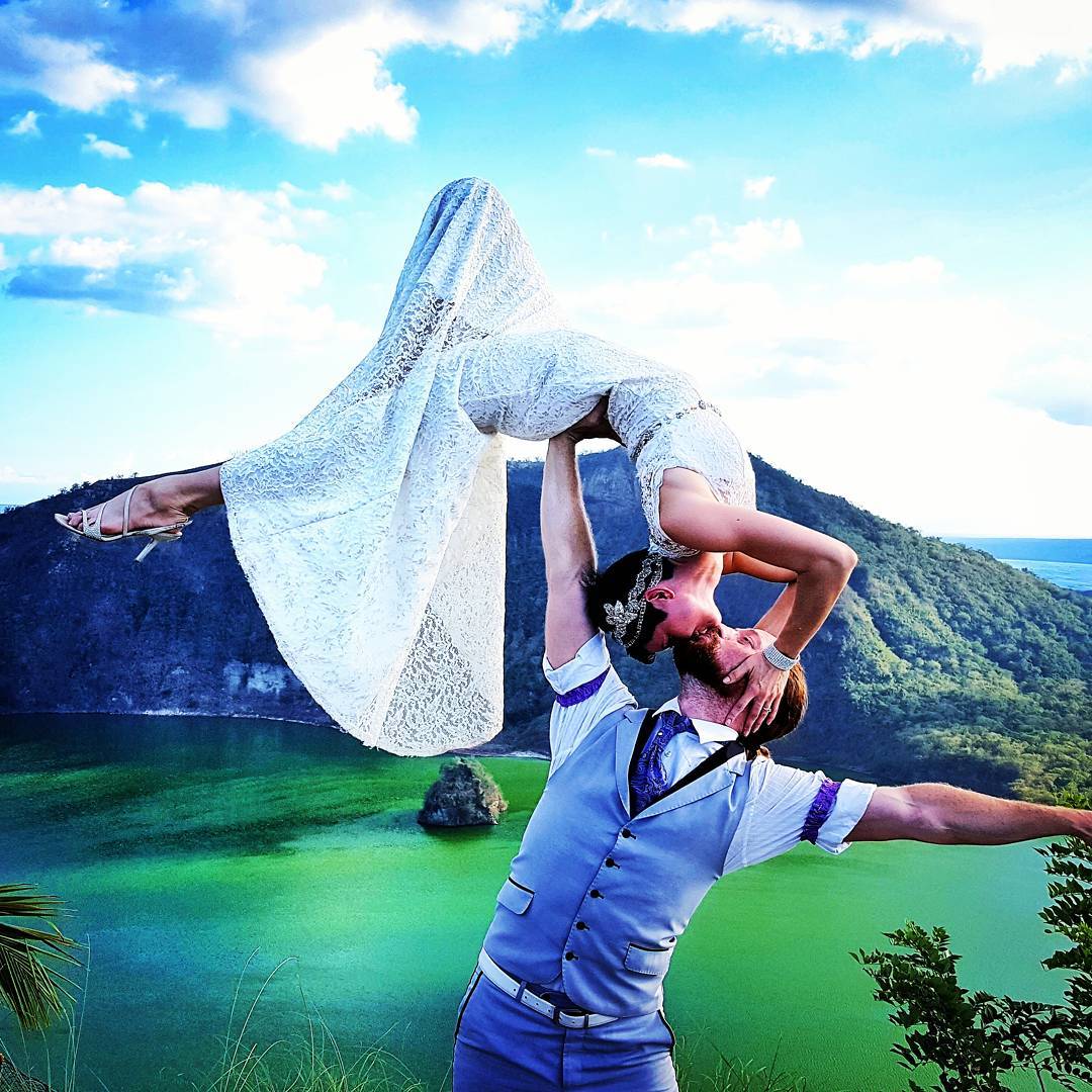 Erstaunliches, akrobatisches Paar hat Hochzeitszeremonien auf der ganzen Welt