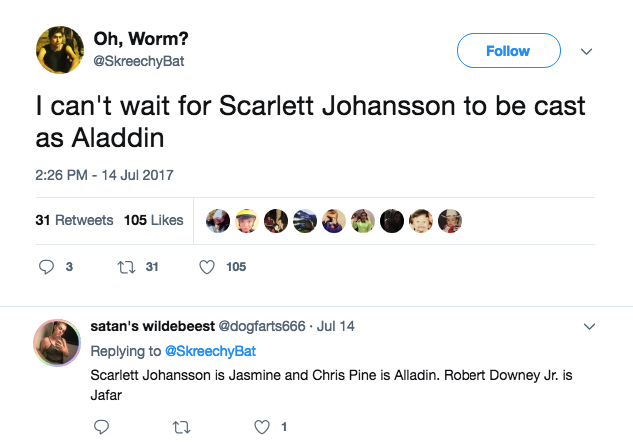 Während die Casting-Direktoren in Hollywood waren Schauspieler für die Hauptrollen der Wahl, setzen die Menschen von Twitter uns darauf, ihre eigenen Vorschläge, die sie als die ideale Aladdin und Jasmin zu sehen. Priyanka Chopra war eine beliebte Wahl für Jasmin und viele Leute wurden darauf hindeutet, Dev Patel für die Rolle von Aladdin.