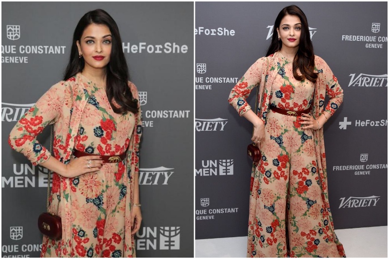 5. Erröten Sie das farbige Kleid mit einem Blumendruck und einer ungewöhnlichen Lippenfarbe für Aishwarya - sie hat keine Angst, zu experimentieren.