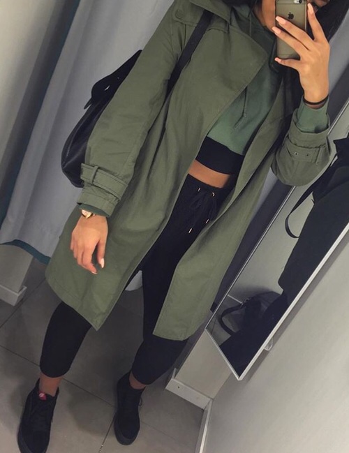 6. Dies ist eine getönte, kozierende Alternative zu den Camo- und Fishnetten. Ein grüner Ladungsmantel, der mit schwarzen Tritten, einem farbblockierten Pullover und montiertem schwarzen Joggern gepaart wurde. Toll mit neutralen Nägeln wie dieses Babe es gestylt.
