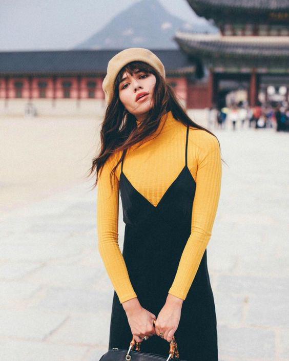 5. Dies ist ein mutiger Look, der möglicherweise nicht für alle funktioniert, aber es bringt uns auf einige der 90er Jahre Nostalgie zurück, und diese Gal trägt es gut. Ein montierter Senf-Rollkragen ist unter einem Tief-V-Spaghetti-Gurt-LBD und einem neutralen Basken geschichtet. Spielen Sie mit der Farbe des Rollkragenspiels herum, um sicherzustellen, dass er Ihren Hautton ergänzt.