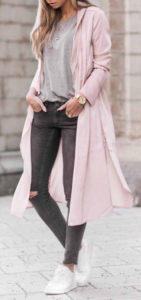 3. Dieser rosa und graue Look gibt uns eine vertraute neutrale Palette, die für sonnige Tage geeignet ist und wenn sich die Blätter ändern. Die Silhouetten sind lässig und bequem, aber schmeichelhaft - ein übergroßer rosa Mantelpaare mit einigen einfachen weißen Tennisschuhen, dunkelgrauen Skinern und einem hellgrauen, gekühltem T-Shirt.