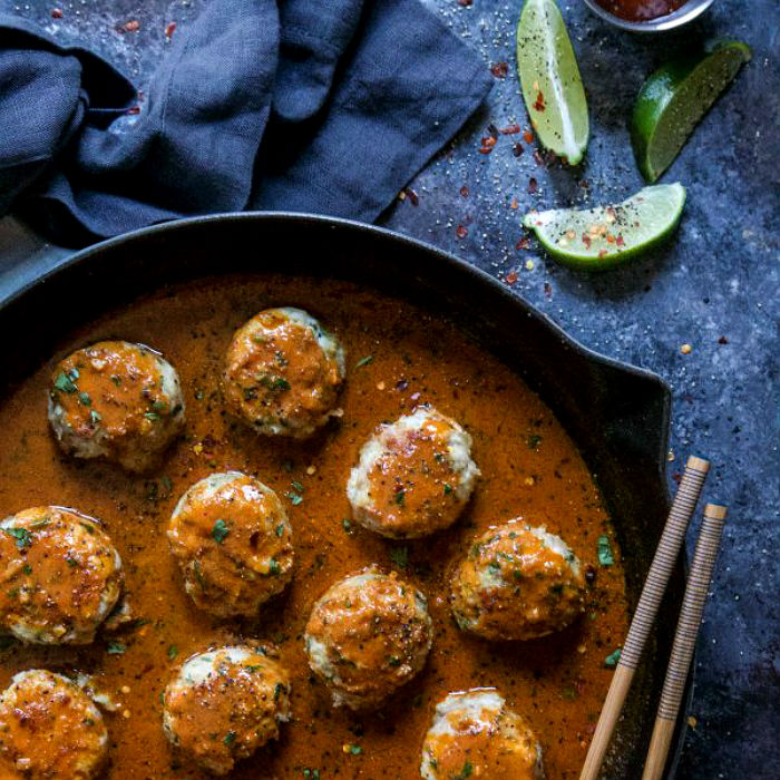 Wir lieben, wenn Köche mit Küche kreativ sind und einen Hybrid erstellen, der eigentlich arbeitet! Dieses italienisch-thailändische Fusion-Teller verbindet einen Fleischball-Klassiker mit einer dekadenten Sauce (hergestellt mit Ingwer, rote Currypaste und Kokosnuss), und Sie können alles in einer Pfanne kochen.