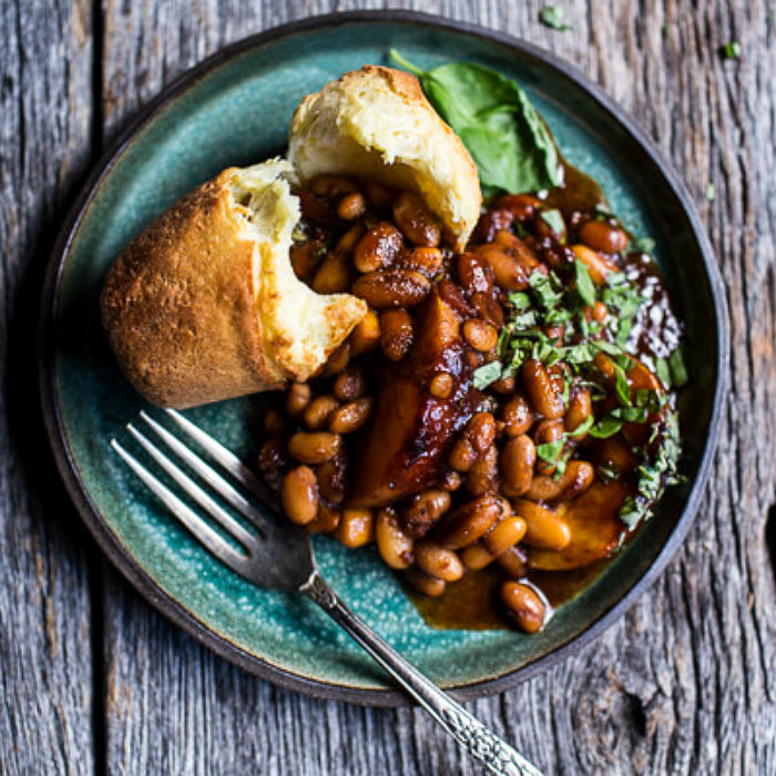 Normalerweise, wenn Sie an gebackene Bohnen denken, denken Sie an ein trauriges britisches Beilage, das eine matschige Kartoffel und einige Eier begleitet. Dies ist ein erstaunlicher Weg, um einen Abschied von Sommer zu sagen - Infusionieren Sie Ihre Bohnen mit Pfirsich und Bourbon, und servieren Sie sie mit einem Hauptgeräten Ihrer Wahl!