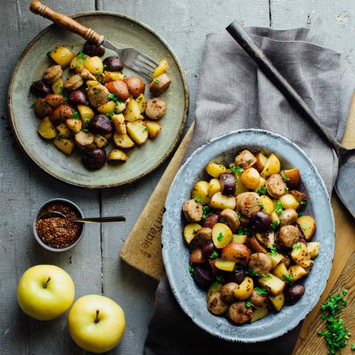 Gebratene Kartoffeln mit Äpfeln, Wurst und Ahorn-Senfglasur