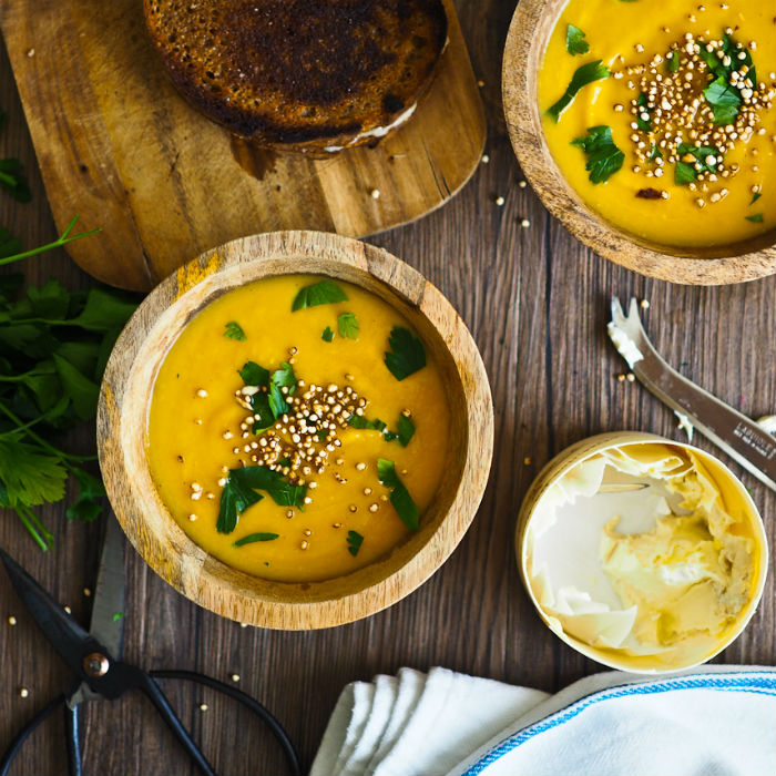 Süßkartoffel, Lauch & Kokosnusssuppe mit Puff-Quinoa