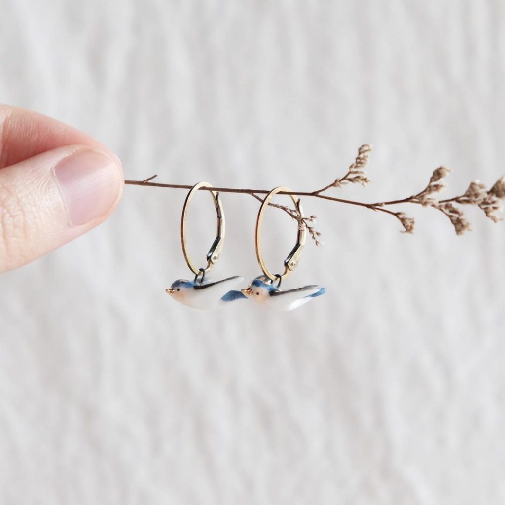 Die Anhänger sind nicht die einzige Zeit, in der dieser Künstler experimentiert hat, indem er ihre Teile in Schmuck verwandelt hat. Diese kleinen Schwalben sind auf 14K Gold-Reifen abgebildet. Sie sind sogar schön alleine auf einem Zweig angestrahlt, als sie hier hat, wenn Ihre Ohren nicht durchbohrt werden.