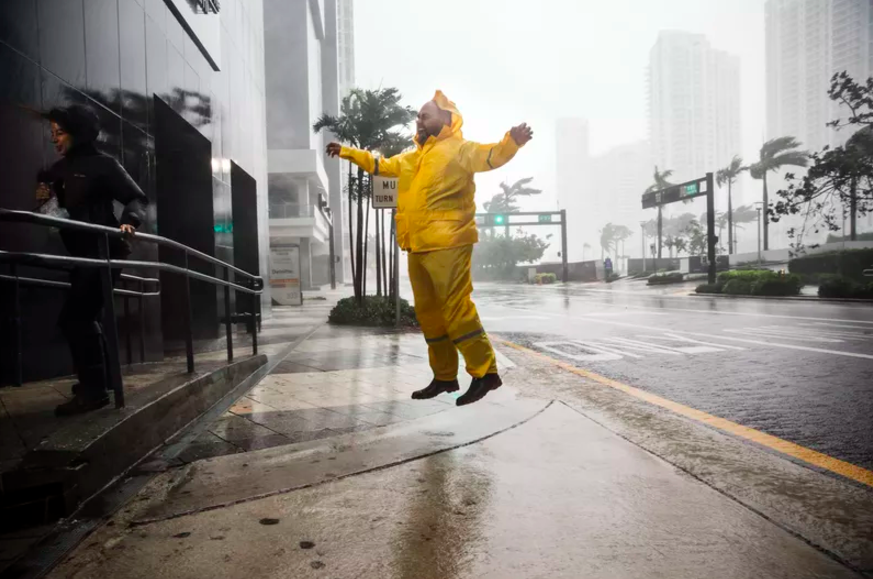 4. Dieser in Miami-Bewohner findet das Silberfutter in den entmutigenden Wolken des Hurrikan-Irma, mit den Böen, die seine Füße in einem surrealen Moment von der Luft schweben. Ich wette, er fühlte sich wie Harry Potter. Nun, zumindest kleidete er sich für den Anlass an! Die Lady nach links scheint nicht so aufgeregt zu sein.