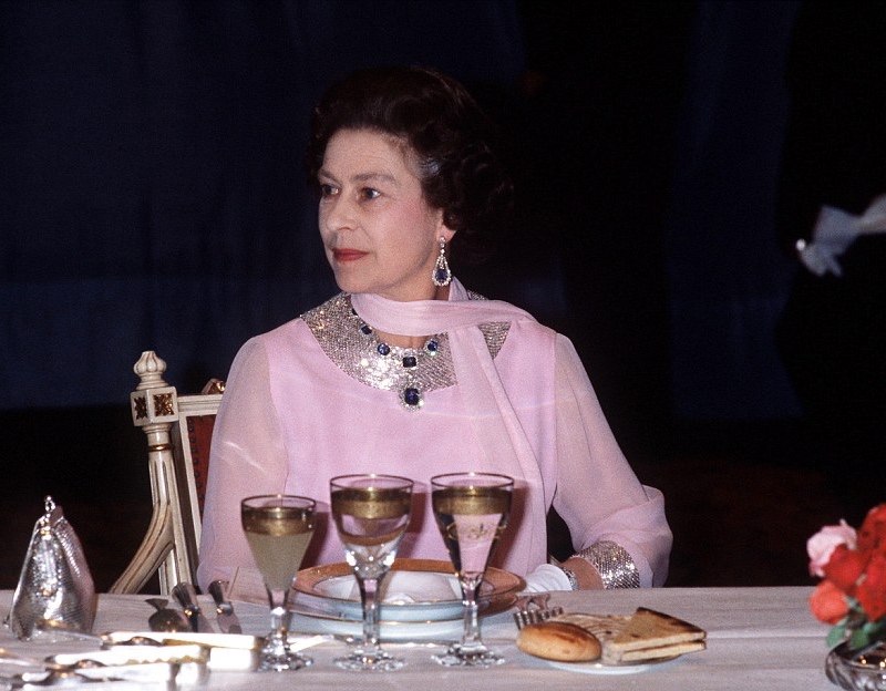 1. Die GEORGE VI Sapphire-Halskette ist einer der Lieblingshalsketten von Elizabeth. Es wurde verwendet, um ursprünglich ein bisschen anders auszusehen. Es hatte 18 Saphir-Cluster. Aber die Königin dachte, kürzere Halsketten ergänzen ihren kleinen Rahmen besser, also hatte sie vier Links entfernt und schaltete einen der größeren Cluster in einen Anhänger, der auch als Brosche getragen werden kann. Das Bild, das Sie sehen, ist 1980 von einem staatlichen Bankett in Algerien.