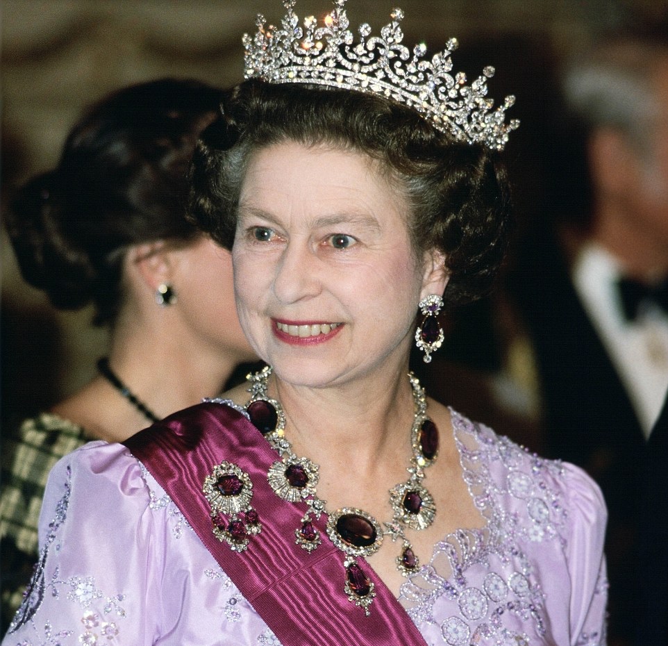 3. Dieses Rubin- und Diamant-Blumenbandeau wurde der Königin von ihren Eltern als Hochzeitsgeschenk gegeben. Diese wunderschöne Halskette besteht aus Silber und Gold und verfügt über eine Fülle von Rubinen. Elizabeth liebt diese Halskette und sie trug es häufig, wenn sie jünger war. Sie verkürte auch diesen, indem sie zwei kleine Blüten an den Seiten entnommen hat, wodurch er an ihrem Hals höher sitzt.
