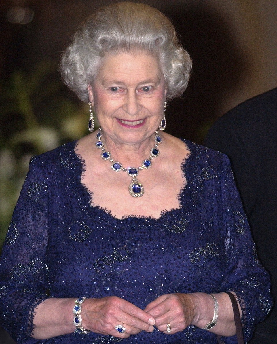 2. Dies ist die gleiche Halskette, die Sie auf dem ersten Bild, aber viele Jahre später gesehen haben. Diesmal trug die Königin es mit einem blauen Kleid und passenden Ohrringen, Armband und sogar einem Ring. Dies ist für Queen Elizabeth ziemlich ungewöhnlich, da sie ihre Hände nicht mag, und zieht es vor, sich nicht auf sie aufmerksam zu machen. Aber sie mochte diese Halskette so sehr, dass sie beschloss, das Armband und den Ring zu betreuen. Schließlich wurde diese Halskette ihr von ihrem Vater gegeben, es macht Sinn, dass sie es so sehr liebt.